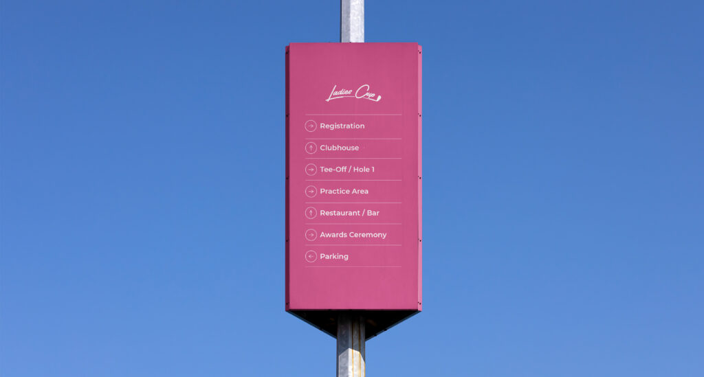 El logotipo principal utiliza una tipografía caligráfica y fluida para «Ladies Cup» , que se complementa sutilmente con un palo de golf integrado. Este trazo manual y elegante se contrasta con una fuente más sobria para el nombre «Buenaventura», que añade solidez y prestigio a la marca. La finalidad es que el diseño actúe como un sello distintivo del evento, proyectando su identidad y prestigio en cada aplicación.