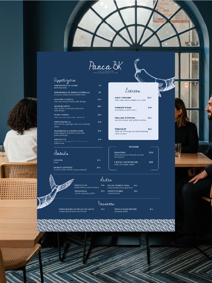 Panca BK buscó resolver el reto de fusionar la rusticidad inherente a una parrilla al carbón con la sofisticación de un restaurante moderno en Brooklyn Heights. La identidad visual se construyó para asegurar una comunicación efectiva que transmita confianza, seriedad y una experiencia envolvente de alta calidad, reflejando el equilibrio entre el mar y la tierra.